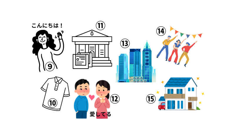 ⑨こんにちは | ⑬都市、街、町 | ||
