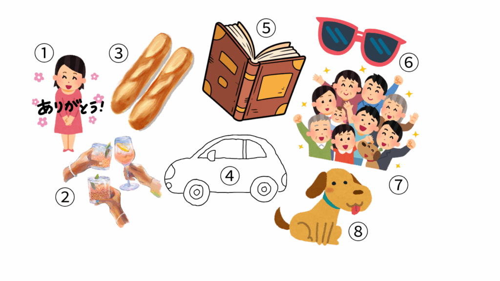 ①~⑧の番号の下記イラストを見てスペイン語で言えるか。