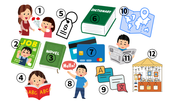 ⑦クレジットカード ⑧話す ⑨言語 ⑩地図帳 ⑪新聞 ⑫店